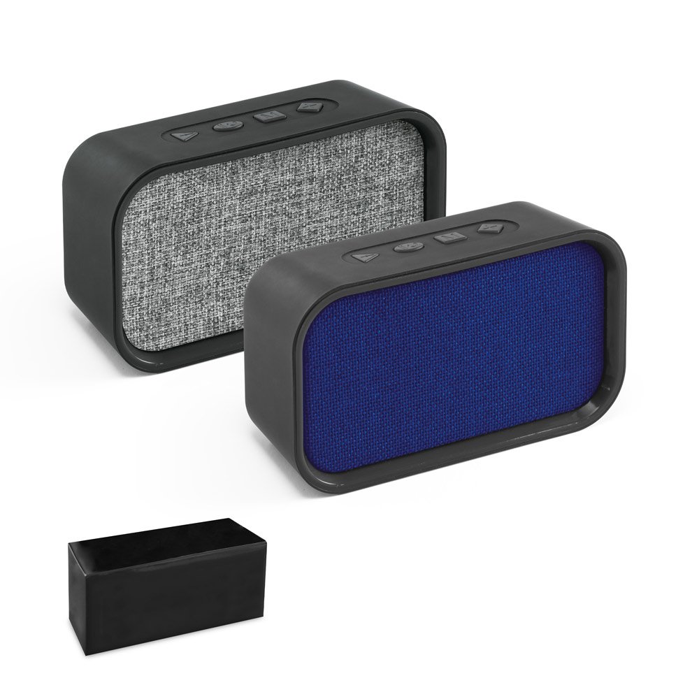 Caixa de som portátil com microfone, em ABS, tecido em poliéster e acabamento emborrachado. Possui transmissão sem fios BT v4.2, potência de 3W/4Ω, ligação stereo 3,5 mm, leitor de cartões TF. A coluna tem autonomia, aproximada, de 2h. Função para atender chamadas, controle de volume, conexão à playlist do dispositivo móvel e rádio FM. Incluso cabo USB para carregar. Fornecida em caixa presente