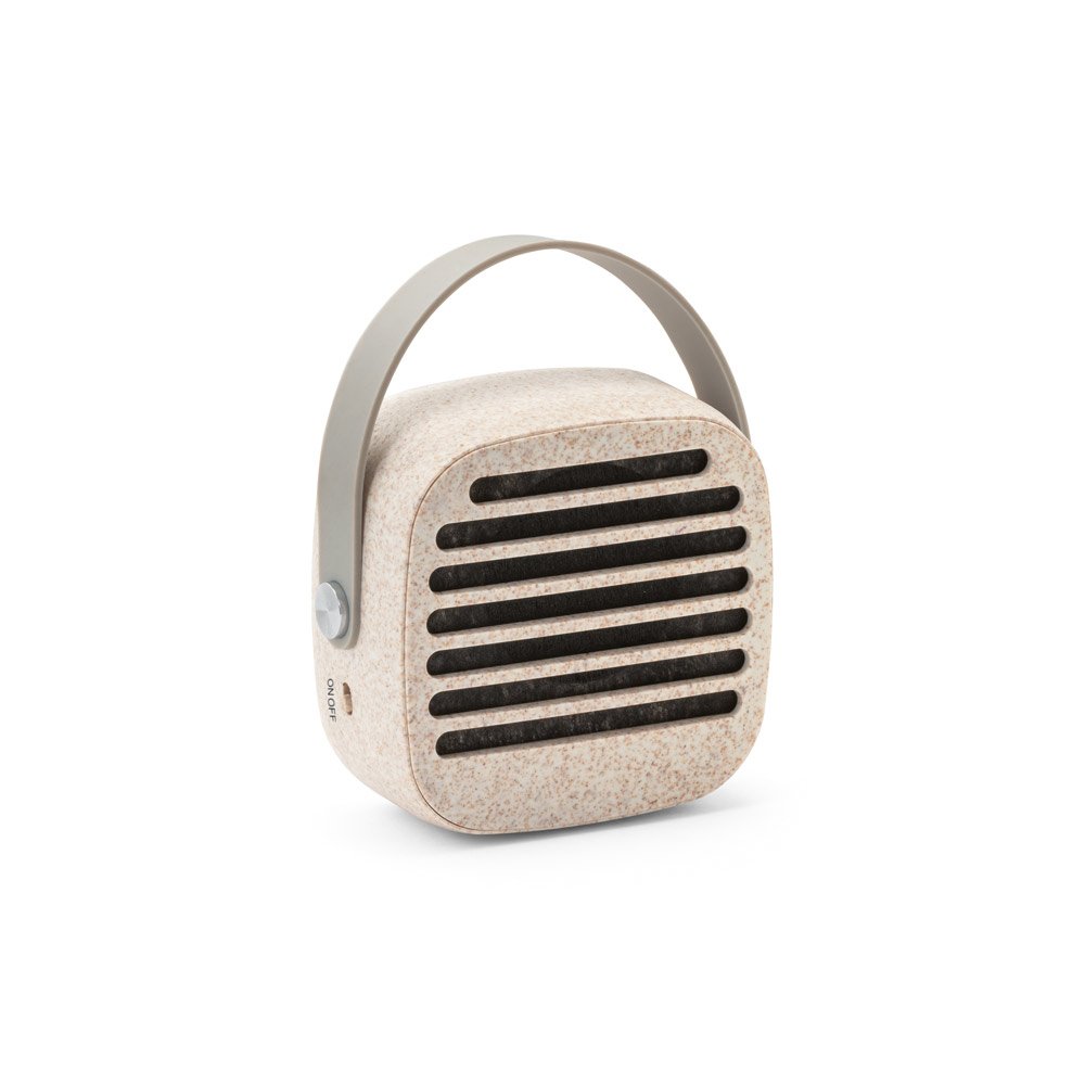 Caixa de som portátil em fibra de palha de trigo e ABS, com alça em silicone para facilitar o transporte. Possui transmissão sem fios BT v5’0, potência de 3W, bateria com 500 mAh e autonomia, aproximada, de 4h30. Incluso cabo USB. Fornecido em caixa presente de papel kraft reciclado. A cor e o resultado da impressão nos materiais naturais pode variar entre produtos. 70 x 70 x 34 mm