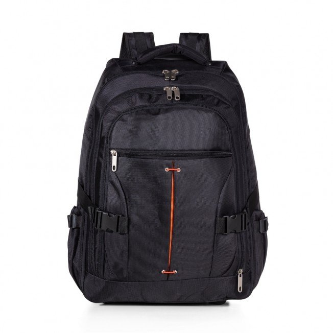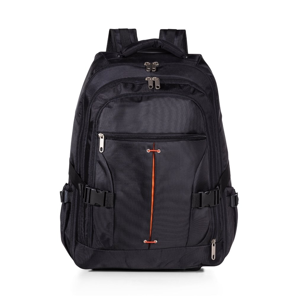 [vc_row][vc_column width=”2/3″]n[vc_column_text]Mochila de nylon com rodinhas. Possui alça de mão, puxador retrátil com regulagem e botão acionador, alças para as costas escondidas no compartimento traseiro com zíper, compartimento mediano com duas divisórias teladas, compartimento mediano também com abertura frontal, possui detalhes laranja e bolsos laterais. O compartimento principal possui bolso para notebook até 15.6 polegadas, forro com zíper. A parte interna conta com um sistema organizatório através de alças de nylon ajustáveis, quando utilizadas impedem que as roupas se movimentem dentro da mochila enquanto à transporta. Possui duas rodinhas e freios em plástico, além de um sistema velcro para junção do compartimento das alças com a parte inferior, tampando as rodinhas enquanto transporta a mochila nas costas. Acompanha plaquinha metálica para personalização. Altura : 59 cmn Largura : 45 cmn Profundidade : 24 cmn n n n Medidas aproximadas para gravação (CxL): 1,2 cm x 4,8 cmn n Peso aproximado (g): 2158n