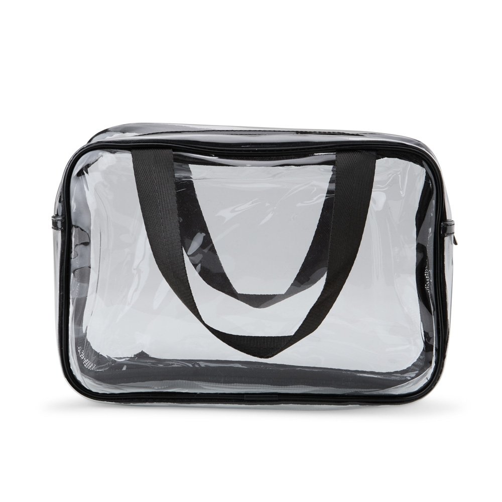 Nécessaire de PVC. Possui dois compartimentos e duas alças laterais de mão em nylon.