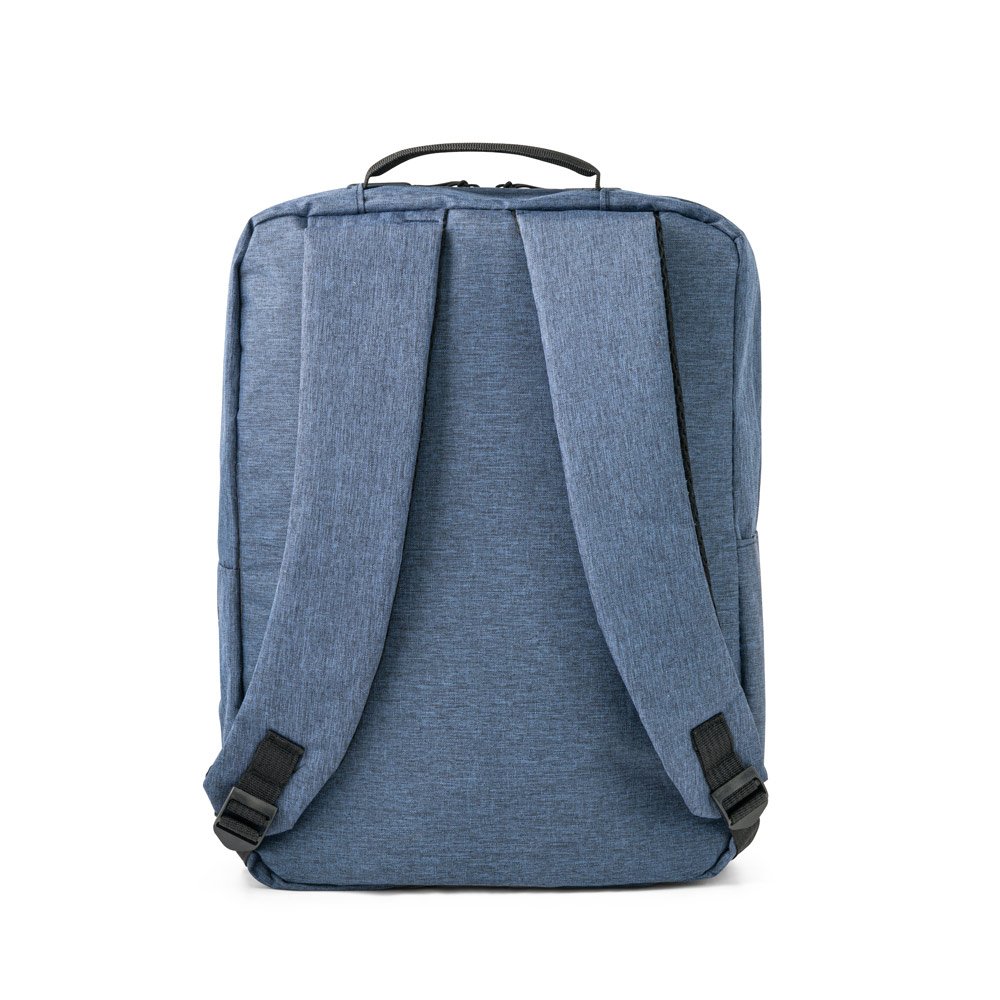 Mochila para notebook em 300D de alta densidade. Compartimento principal forrado, com divisória almofadada para computador até 15’6″ e diversos bolsos interiores. Contém ainda bolso frontal e 2 bolsos laterais. Parte posterior e alças almofadadas. Capacidade até 15 L. 300 x 420 x 120 mm