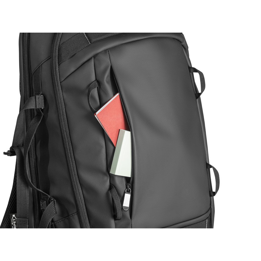 Mochila para notebook em poliéster reciclado 900D de alta densidade, com revestimento resistente à água, e forro em poliéster reciclado 210D. Possui 1 compartimento traseiro com divisória almofadada para notebook até 17’3″ e um bolso frontal com zíper. Contém parte posterior com acolchoamento extra, cintas de compressão removíveis na parte frontal da mochila e detalhes refletores nas pegas e alças. Capacidade até 21 L 340 x 490 x 140 mm