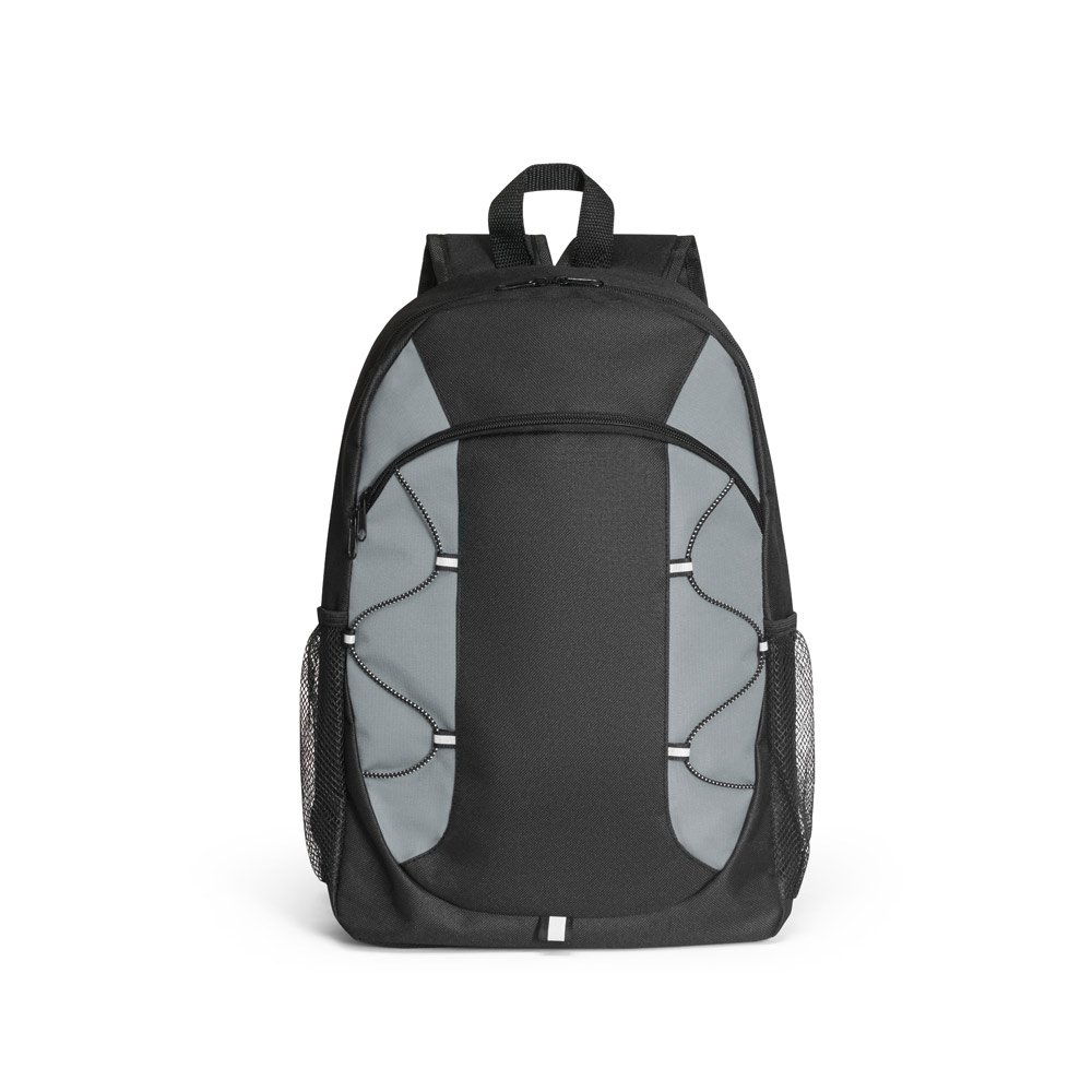 Mochila em 600D com detalhes em ripstop colorido. Bolso principal com zíper e bolsos laterais em tela mesh. Parte posterior e alças almofadadas. Contém diversos elementos refletores. Capacidade até 16 L. 290 x 440 x 120 mm