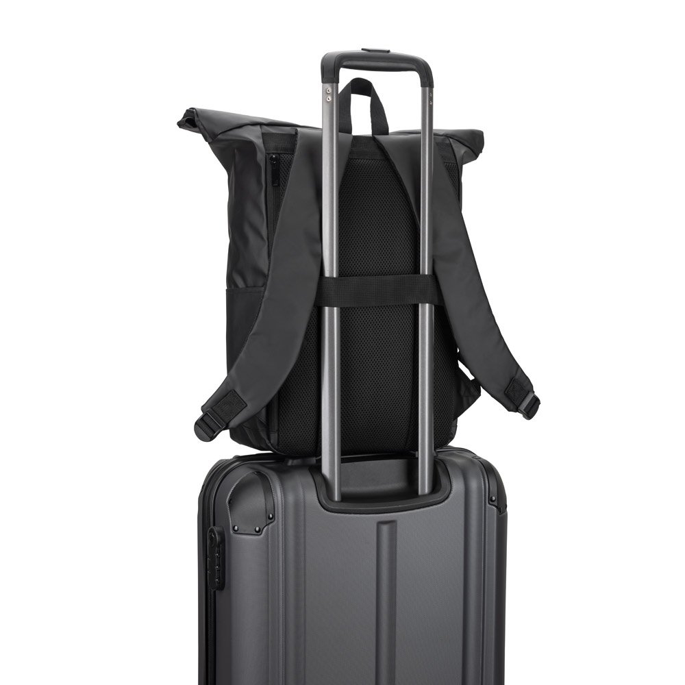 Mochila “Roll top”, um design em sistema de fecho que permite enrolar a parte superior até, ajustar ao volume da mochila. Composta por polié,ster reciclado 600D de alta densidade com revestimento resistente à agua e forro em polié,ster reciclado 210D. Possui um compartimento principal com bolso almofadado para notebook até, 14″, bolsos laterais e um bolso frontal com zíper impermeável. O acesso ao notebook pode ser feito pelo compartimento principal ou na parte posterior atravé,s do zíper. A parte posterior em malha incorpora uma alça trolley. Capacidade até, 20 L. 270 x 440 x 150 mm