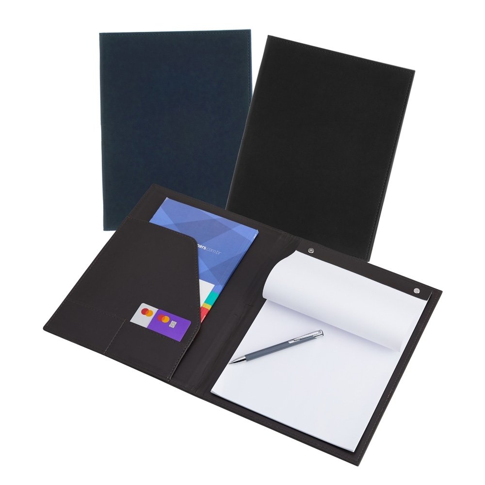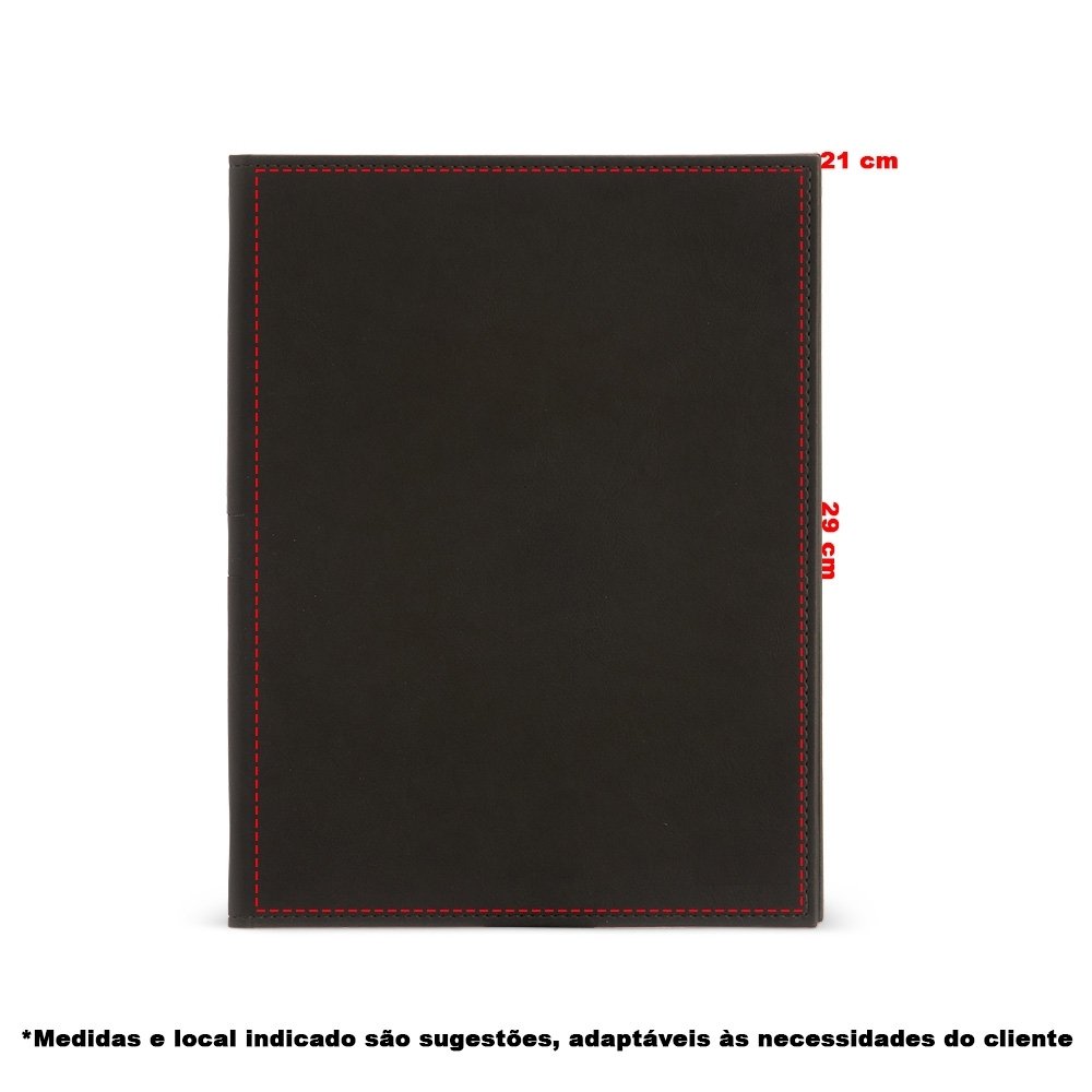 Pasta convenção de couro sintético, possui porta caneta, compartimento para arquivar documentos, dois bolsos para cartões e um bloco com aproximadamente 25 folhas brancas não pautadas. Largura :  24,2 cm Espessura :  1,5 cm Comprimento :  31,6 cm Medidas aproximadas para gravação (CxL):  29 cm x 21 cm Peso aproximado (g):  475