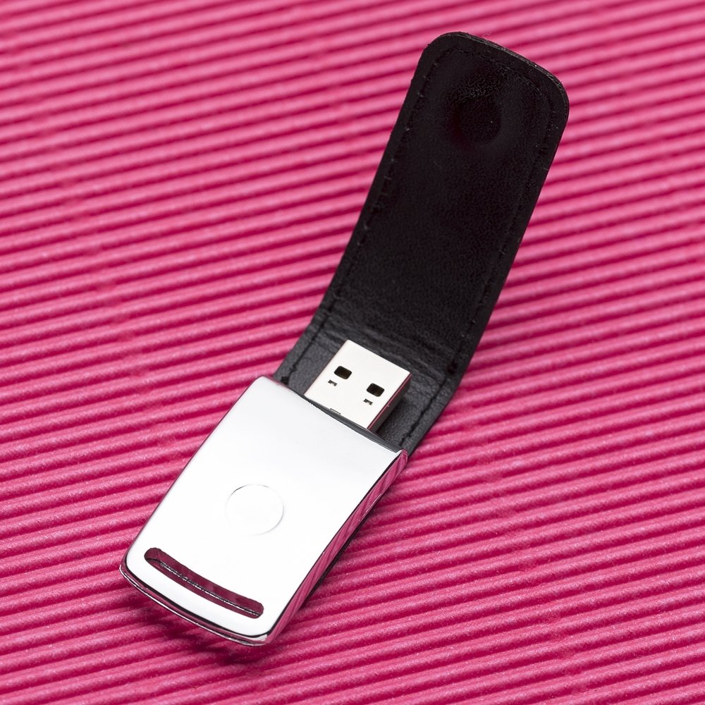 Pen drive metálico com detalhe em couro sintético, com fechamento imantado.