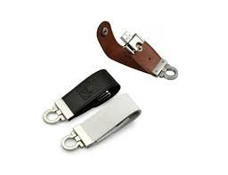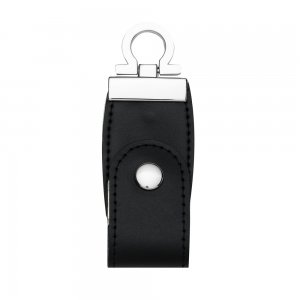 Pen drive de couro sintético com costura, possui botão e detalhes prata(verso liso). Parte inferior possui “argola” para utilizar como chaveiro.
