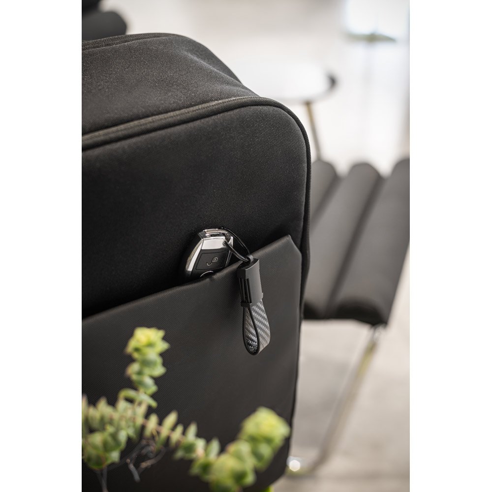 Chaveiro em c. sintético com textura em fibra de carbono e metal. Fornecido em caixa presente de papel kraft reciclado. 35 x 100 x 10 mm
