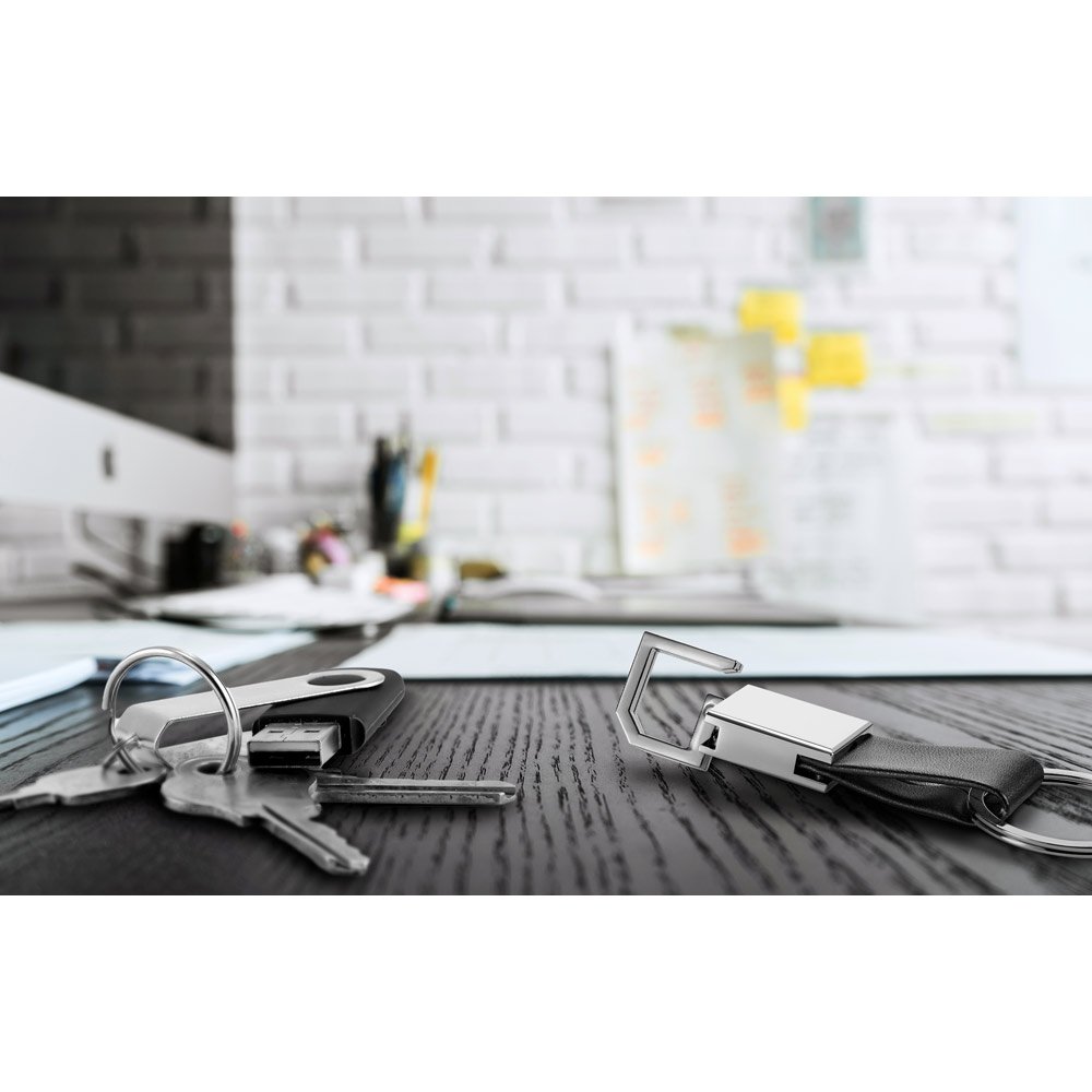 Chaveiro em c. sintético e metal com mosquetão. Fornecido em caixa presente de papel kraft reciclado. 21 x 77 x 8 mm