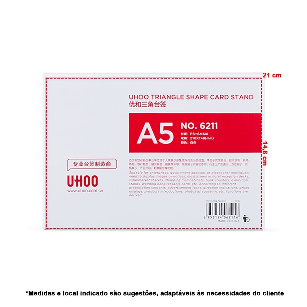 Expositor porta retrato A5 feito em poliestireno com placa acrílica.
