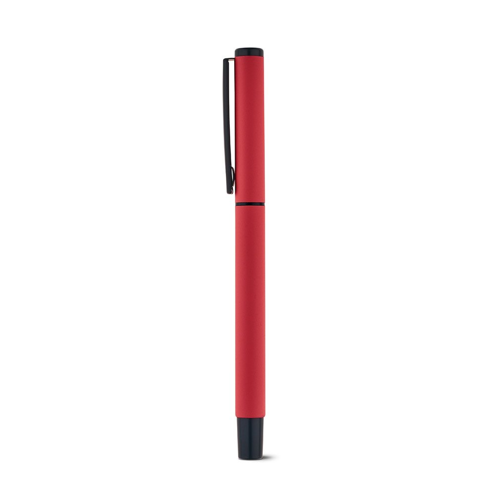 Roller em alumínio com clipe de metal e acabamento emborrachado. Escrita em preto. ø10 x 136 mm