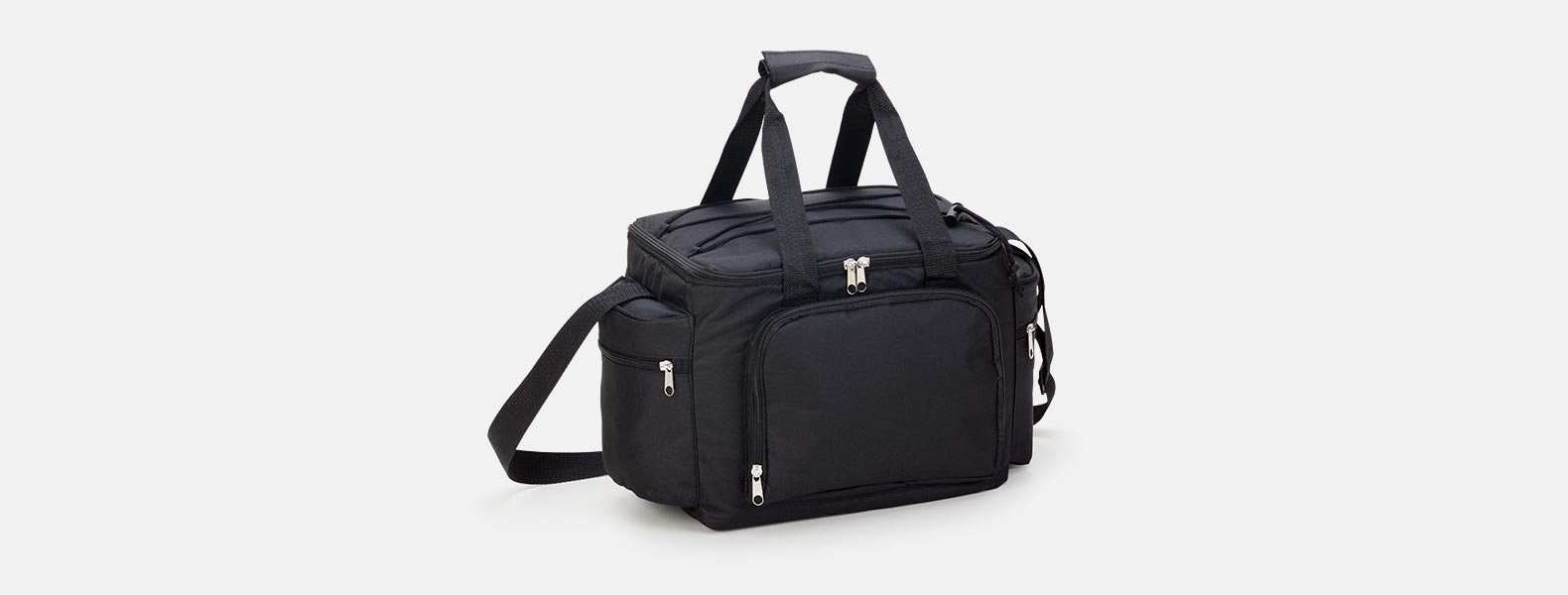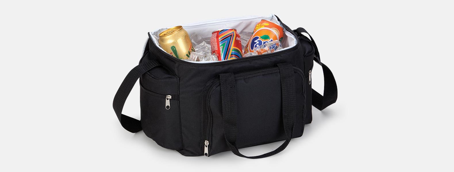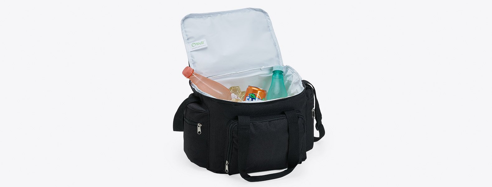 Confeccionada em polyester e revestido em PEVA branco a prova d’água, atóxico e mais sustentável que o PVC, possui alças de mão e ombro, um bolso frontal, dois bolsos laterais com zíper e elástico superior trançado. O tempo médio de conservação para frio são de 10 horas, para quente são de 3 horas. Capacidade: 14 litros / Cerca de 12 latinhas de 350ml.Código: MP-15141