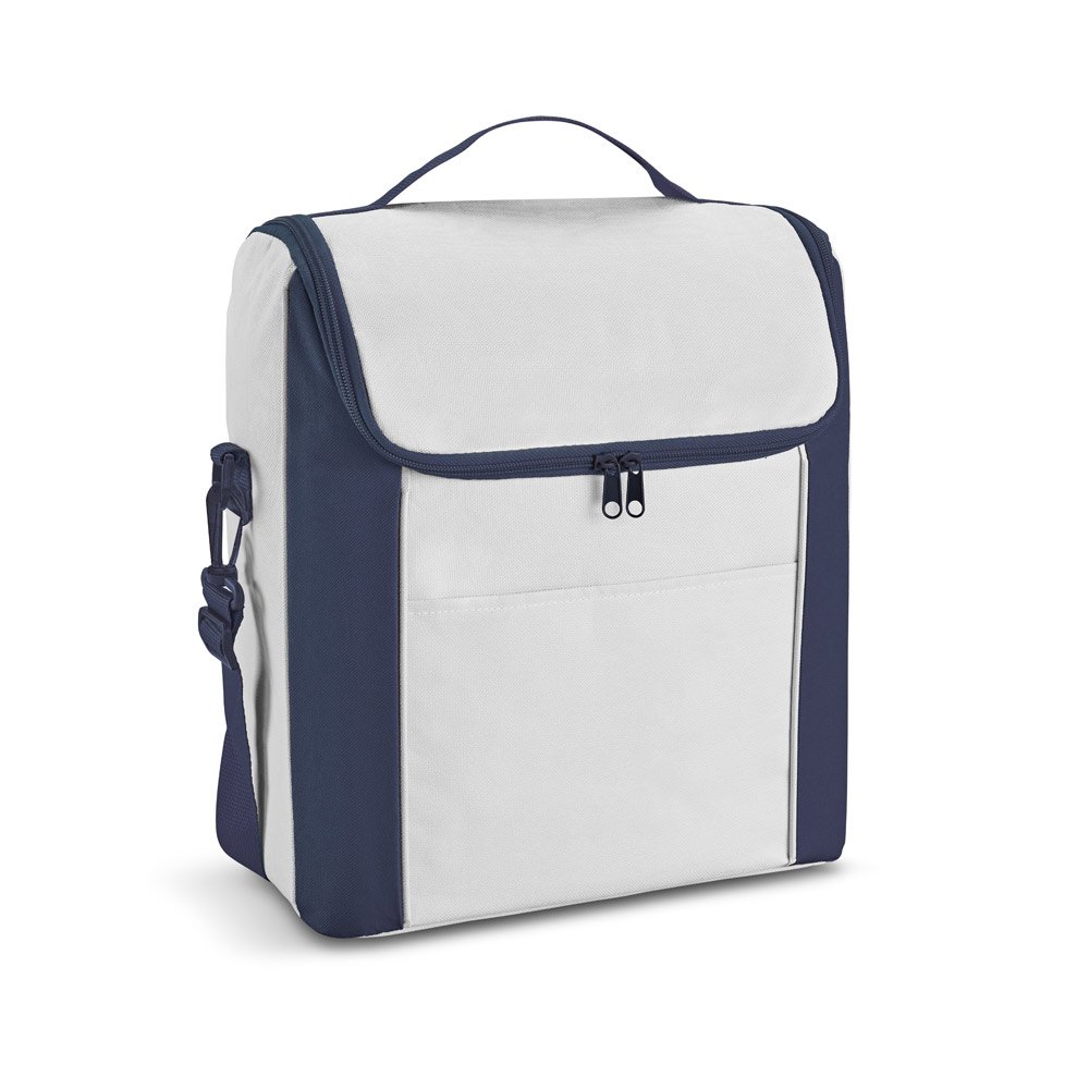 Bolsa térmica em 600D com zíper duplo, alça ajustável em webbing e bolso frontal. Capacidade até 18 L. Certificação EU Food Grade. 290 x 340 x 190 mm