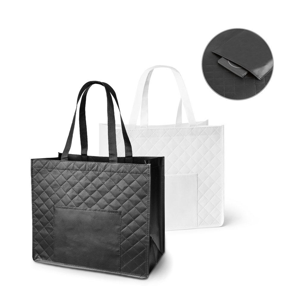 Sacola em TNT laminado (110 g/m²) com bolso frontal (175 g/m²). Sacola ideal para compras. 381 x 330 x 200 mm