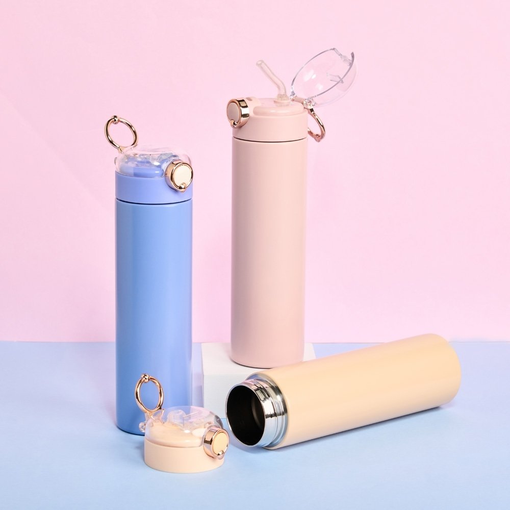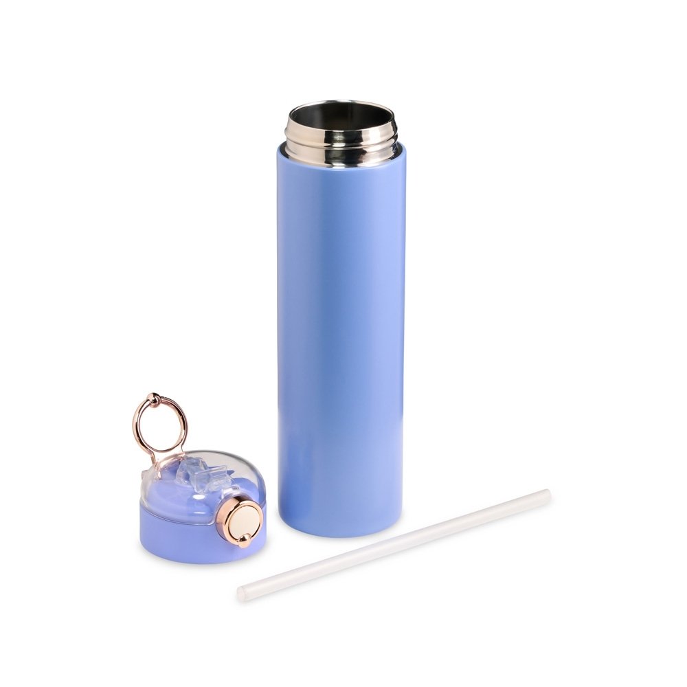 Garrafa Térmica feito em inox 304 com parede dupla e capacidade de 500ml. Possui tampa protetora com botão de acionamento para o bico, alça e acompanha um canudo.