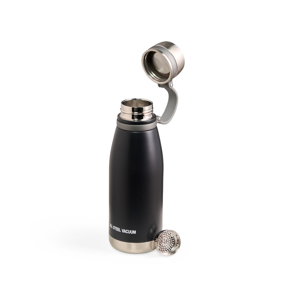 Garrafa térmica com infusor de bebidas, feita em inox 316 com capacidade de 650ml e alça de silicone acoplada na tampa.