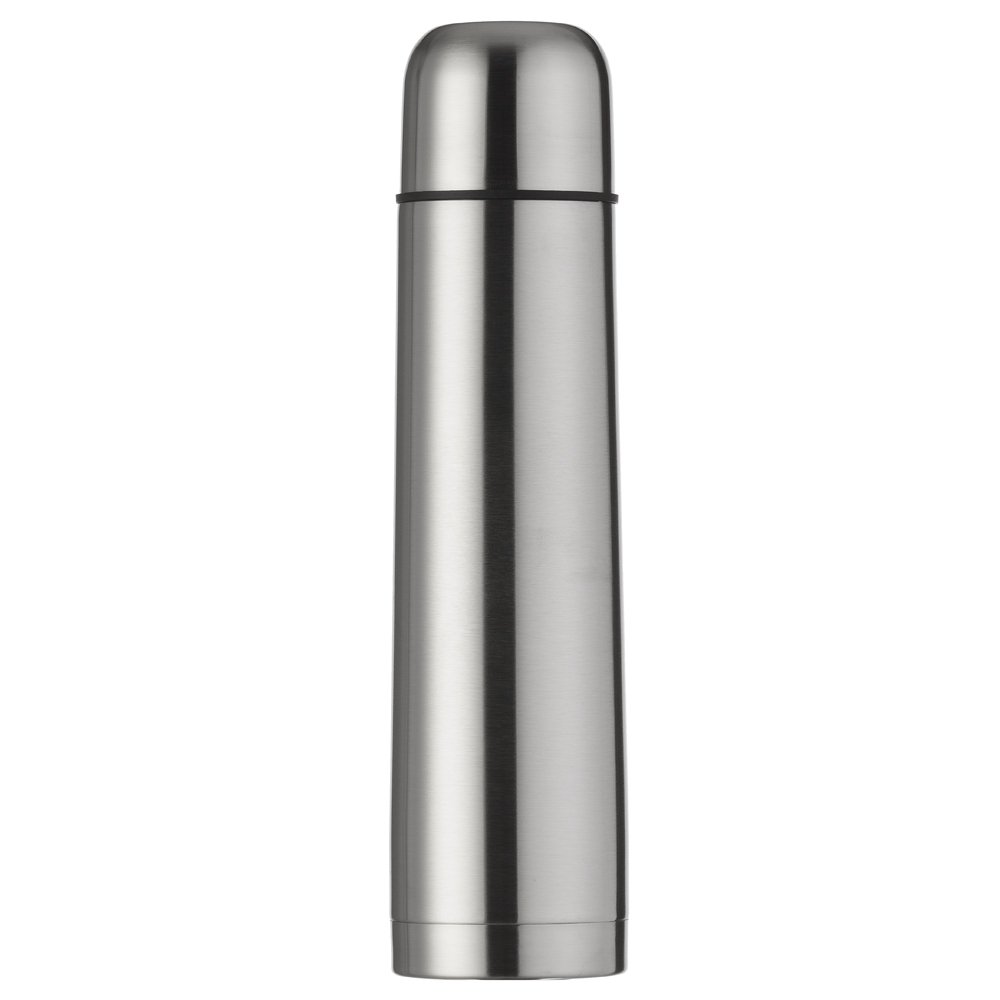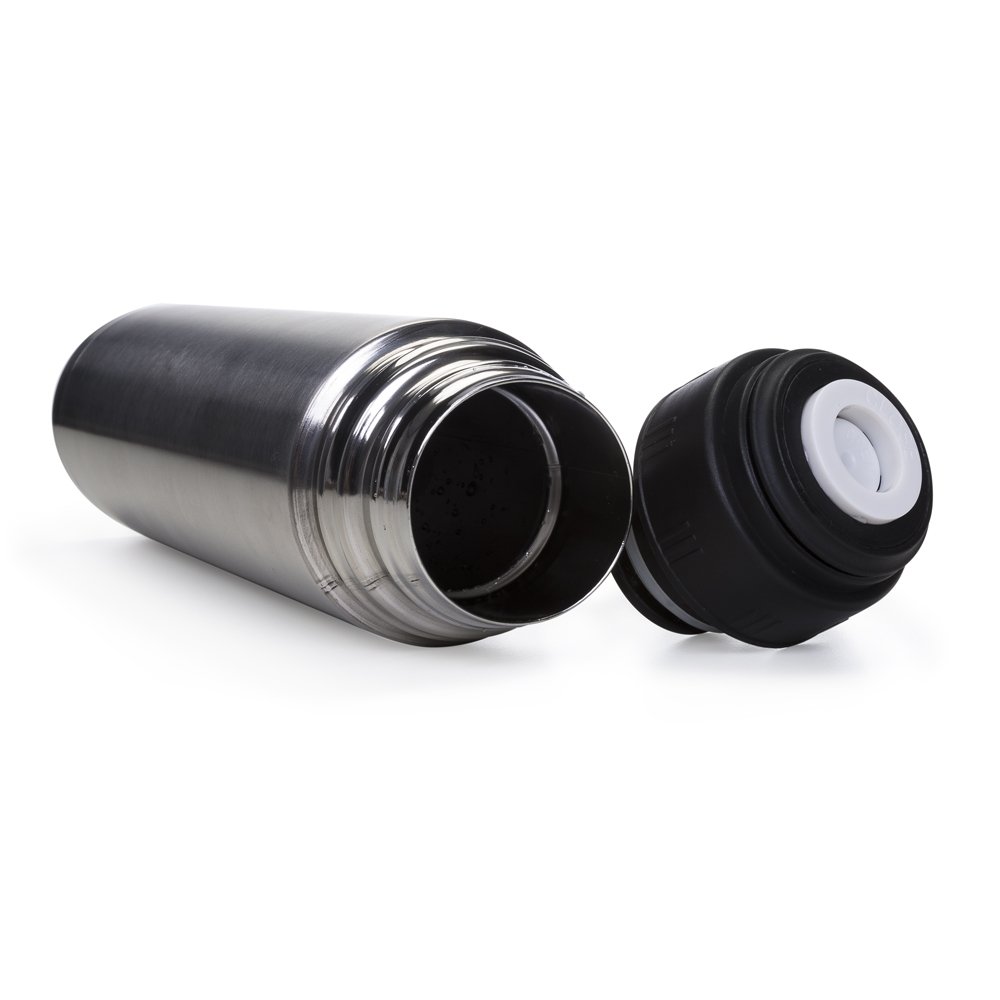Garrafa térmica 1L em inox com tampa rosqueável, tampa interna em plástico resistente(basta um clique para abrir ou fechar). Acompanha capa protetora de couro sintético com alça em nylon e detalhe vermelho.