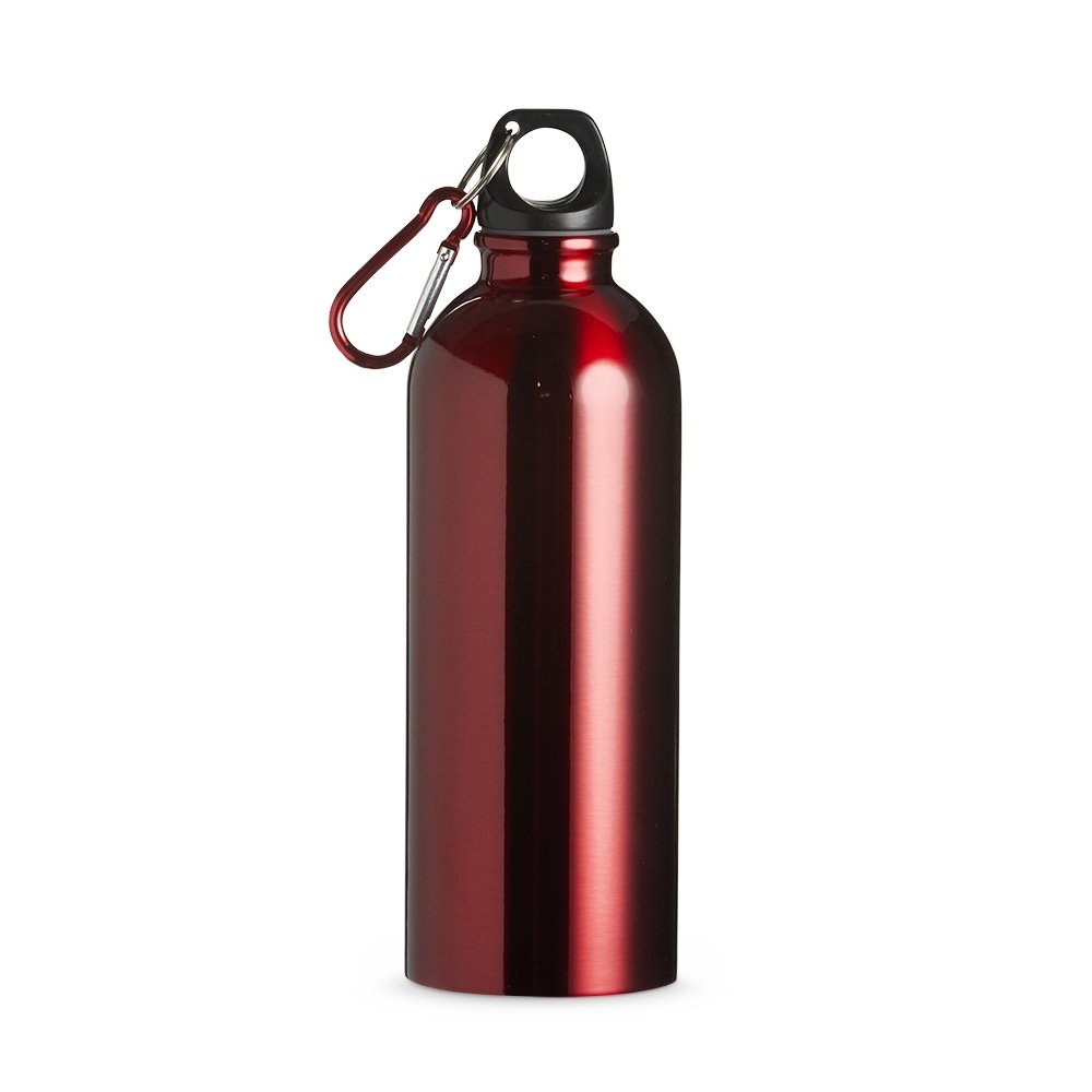 Squeeze 500ml de inox com pintura metalizada, tampa rosqueável e acompanha um segundo bico com mosquetão (não é térmico).