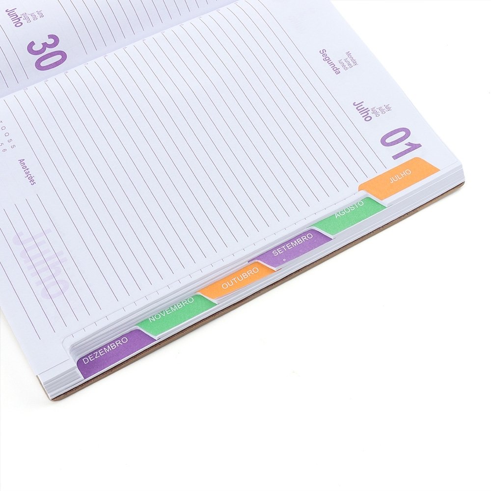Agenda 2024 de couro sintético com abas mensais e marcador de página em cetim. Contém folhas para dados pessoais, calendários 2024 à 2026, planejamento 2024, DDI, página de conversões e páginas de contatos.