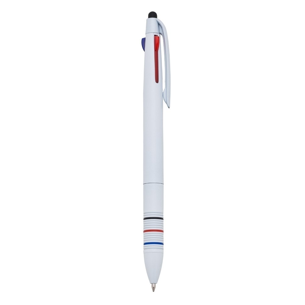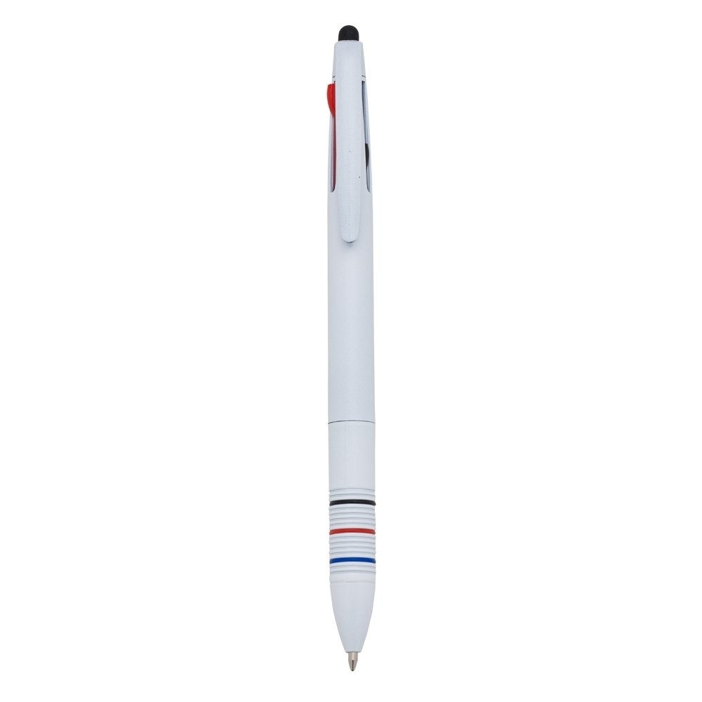 Caneta plástica 3 em 1 com touch screen, cargas esferográficas nas cores: azul, preto e vermelho.