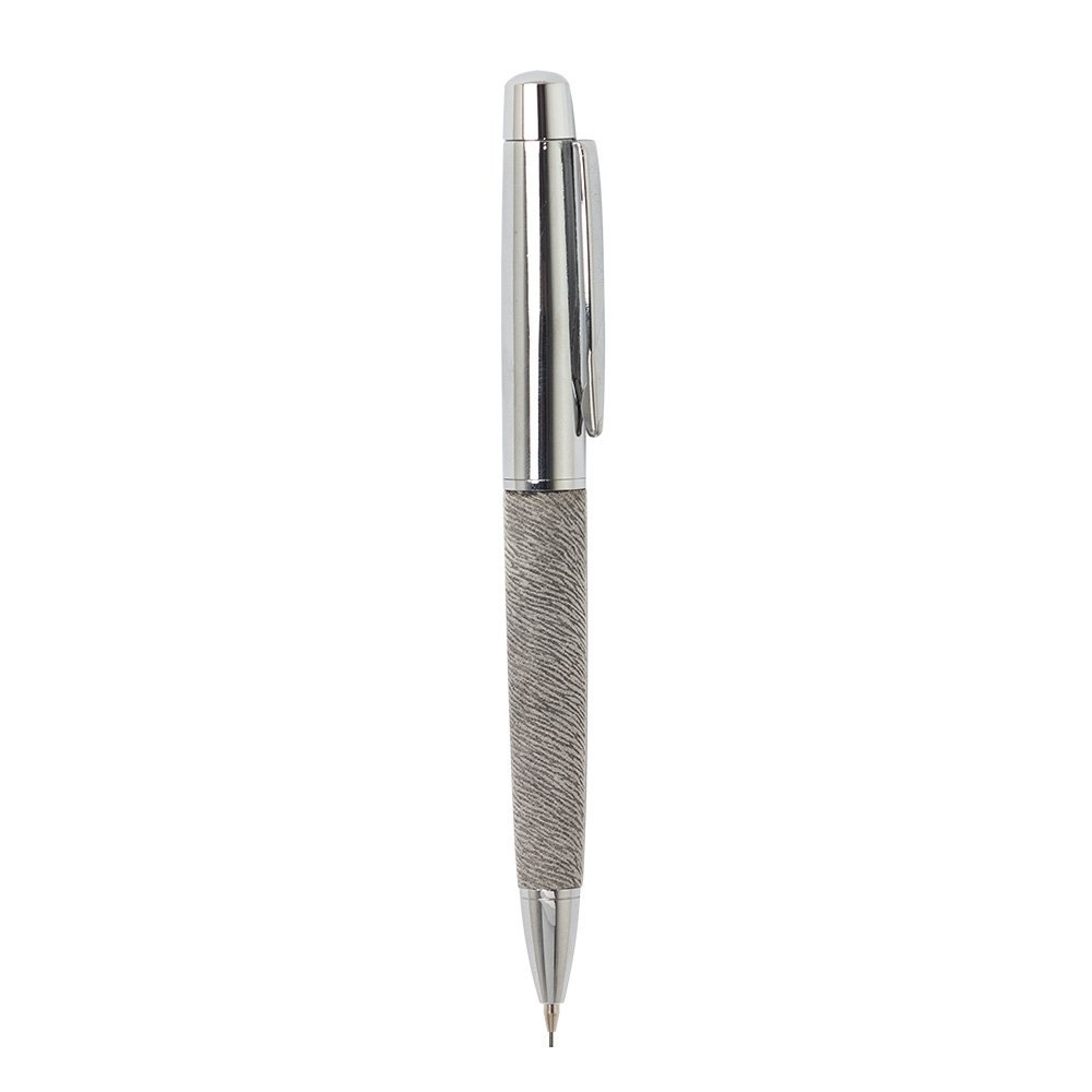 Conjunto caneta e lapiseira em estojo de cartonagem com placa central para personalização. Caneta/Lapiseira metal prata com detalhes diferenciados na parte inferior, clip metal com detalhe de linha no centro. Acionam por giro. Estojo revestido com espuma na parte interna. Medidas aproximadas para gravação (CxL):  Caneta/Lapiseira 4,7 cm x 1 cm – Estojo 4,1 cm x 1,6 cm Tamanho total aproximado  (CxL):  Caneta/Lapiseira 13,8 cm x 1,6 cm – Estojo 18 cm x 6,5 cm Peso aproximado (g):  139