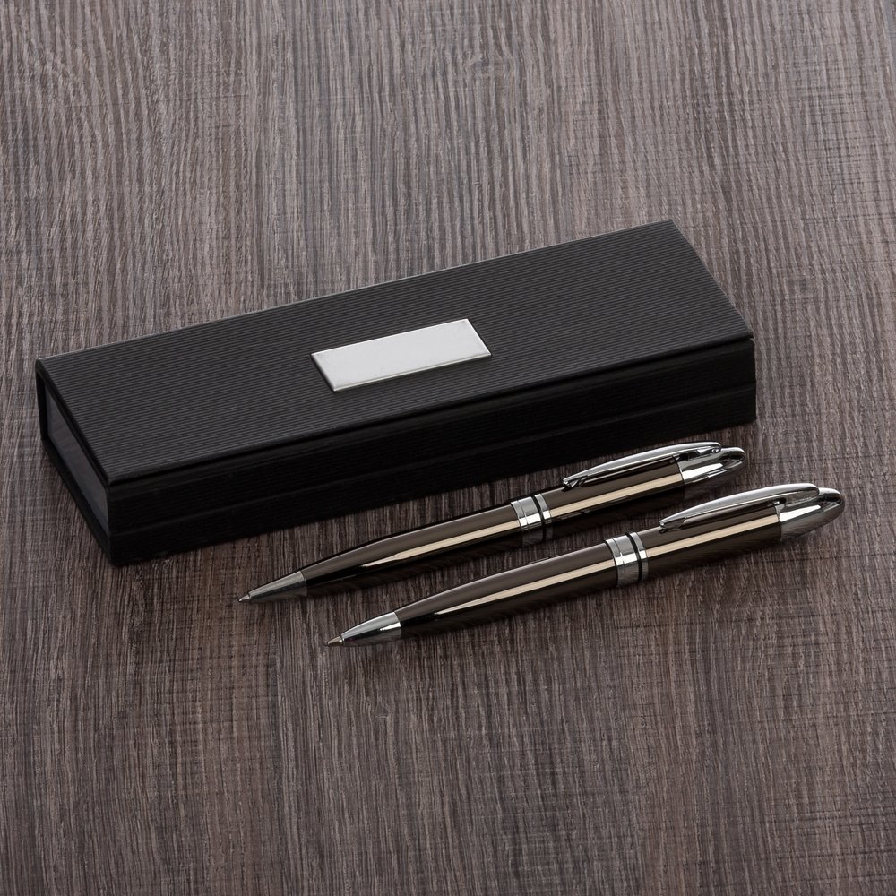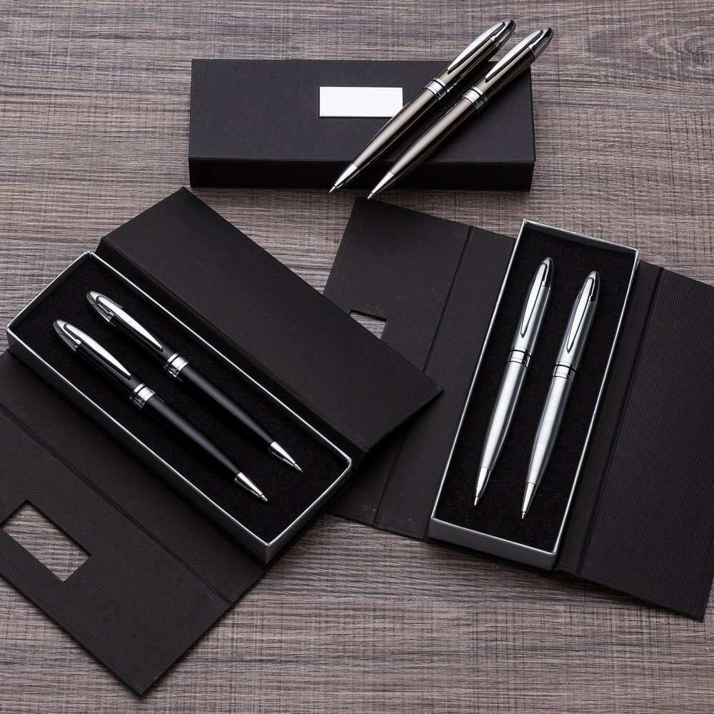 Conjunto caneta e lapiseira em estojo de cartonagem com placa central para personalização. Clip metal e anel central possui: anel fino prata, anel preto fino e um anel maior prata com relevo e acionam por giro. Estojo revestido com espuma na parte interna. Altura :  18 cm Largura :  6,5 cm Medidas aproximadas para gravação (CxL):  Caneta/Lapiseira 3,7 cm x 1,2 cm – Estojo 4,1 cm x 1,6 cm Peso aproximado (g):  129