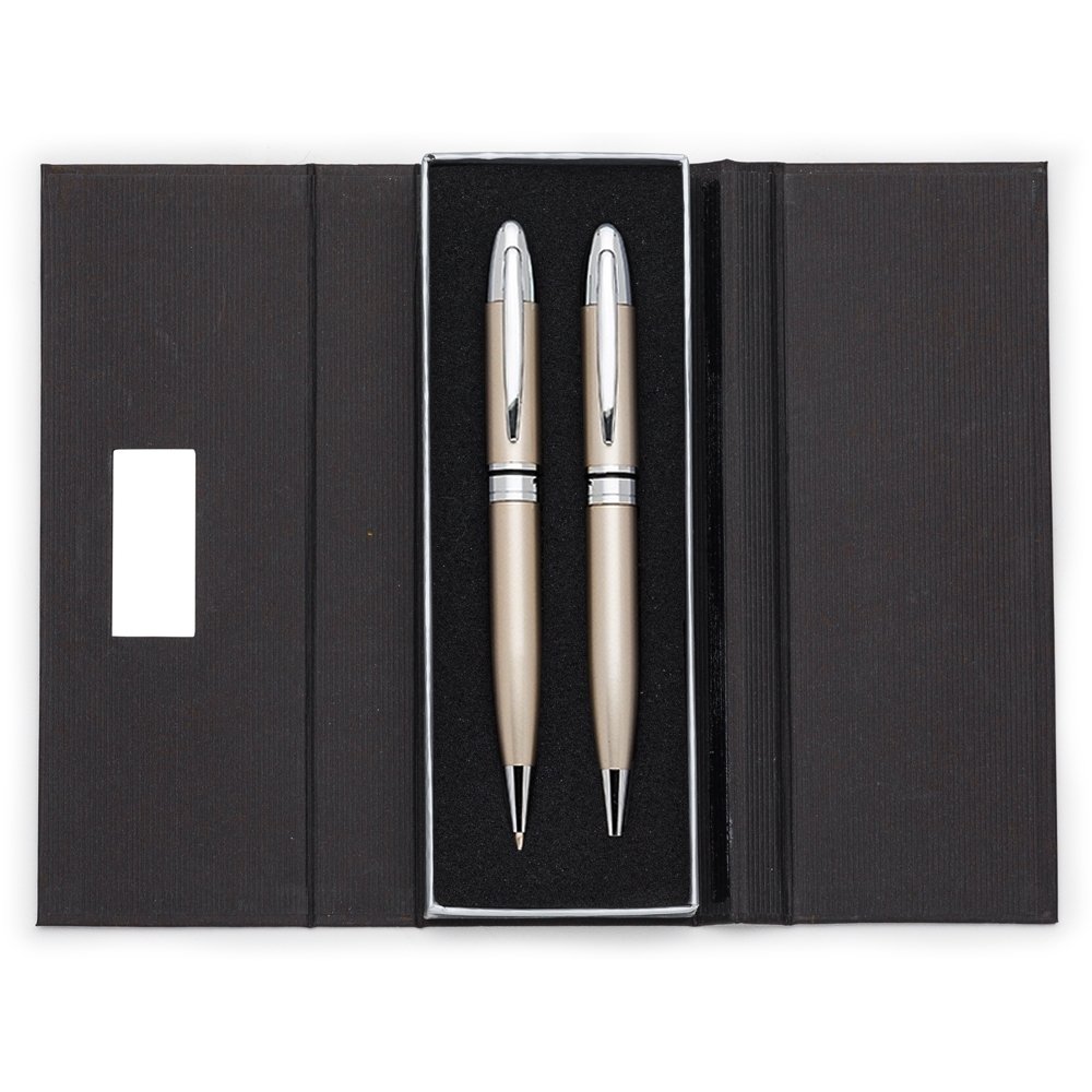 Conjunto caneta e lapiseira em estojo de cartonagem com placa central para personalização. Clip metal e anel central possui: anel fino prata, anel preto fino e um anel maior prata com relevo e acionam por giro. Estojo revestido com espuma na parte interna.