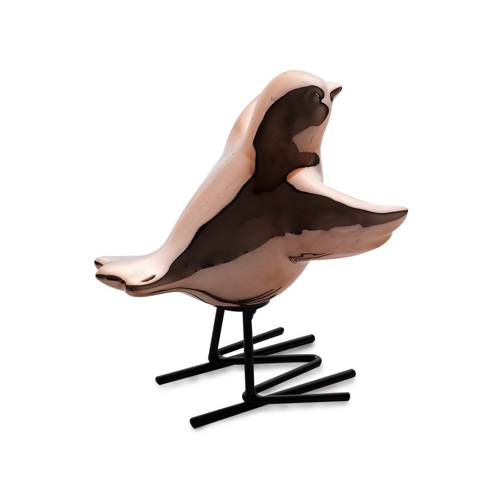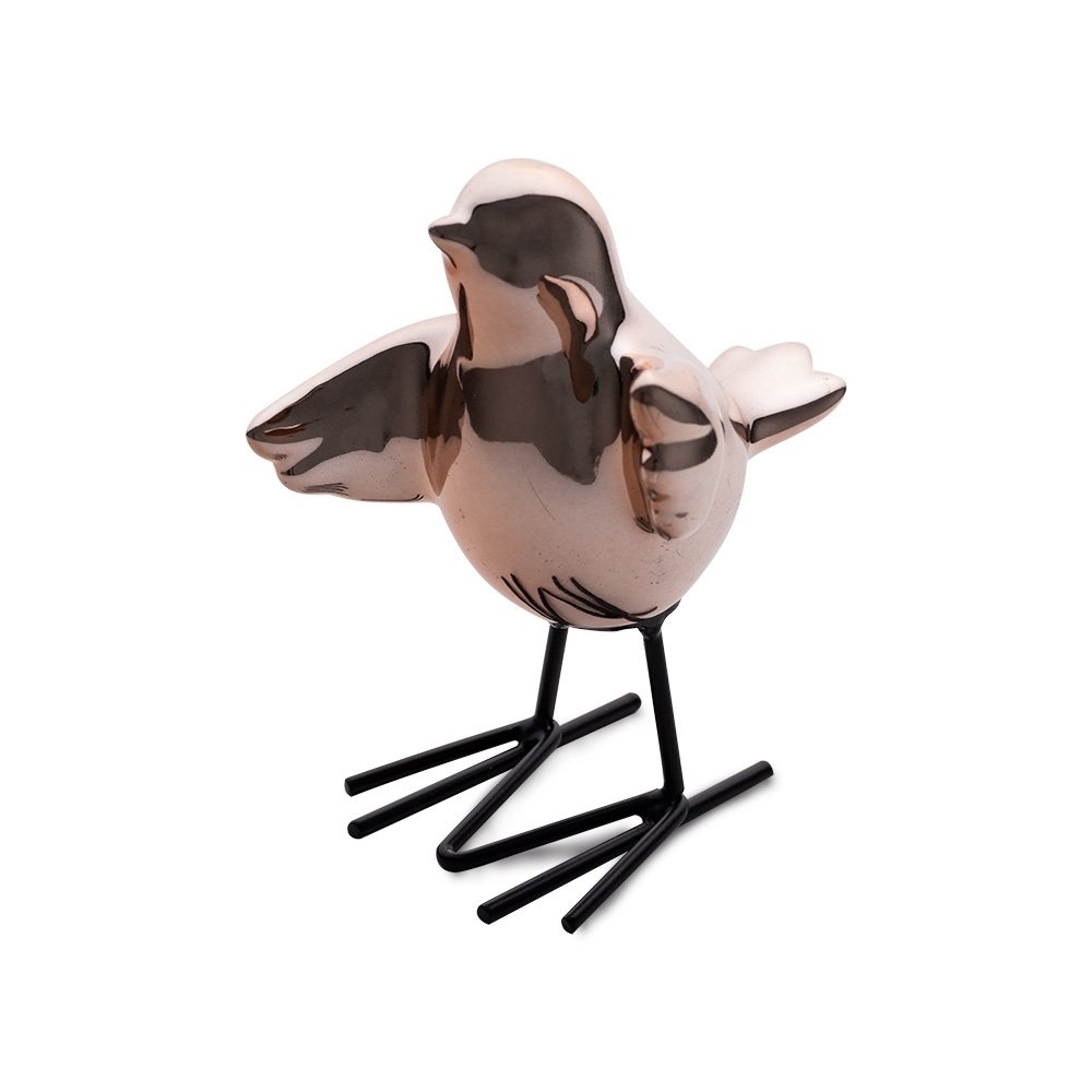 Enfeite decorativo de porcelana em formato de passarinho com pés de ferro.